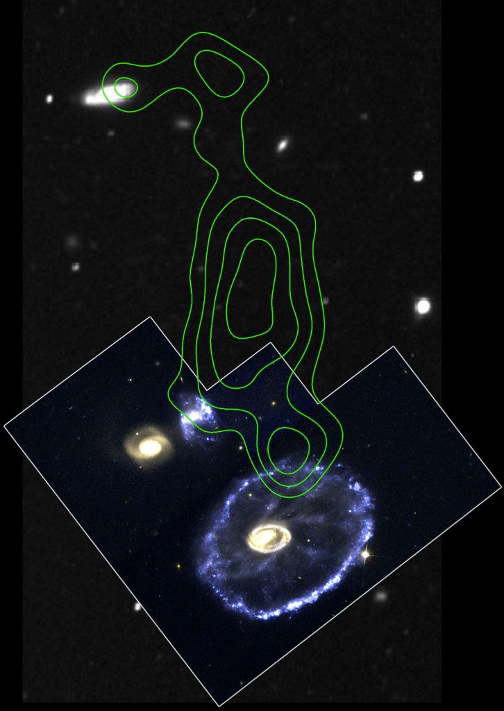 The Cartwheel is part of a group of four galaxies, as shown in this collage of images from ground-based optical and radio telescopes and the Hubble Space Telescope’s Wide Field and Planetary Camera 2. Curt Struck and Philip Appleton (Iowa State University), Kirk Borne (Hughes STX Corporation), and Ray Lucas (Space Telescope Science Institute), Jim Higdon (Australia Telescope National Facility’s Paul Wild Observatory), Victor Blanco (Cerro Tololo)