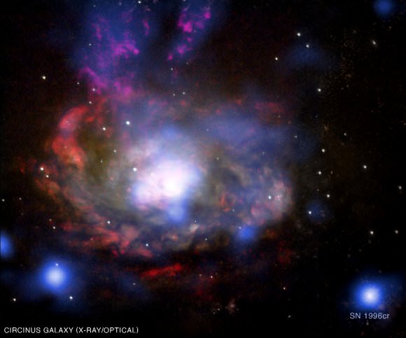This composite image shows the central regions of the nearby Circinus galaxy, located about 12 million light years away. Data from NASA�s Chandra X-ray Observatory is shown in blue and data from the Hubble Space telescope is shown in yellow, red, cyan, and light blue.