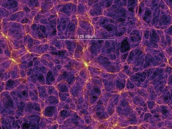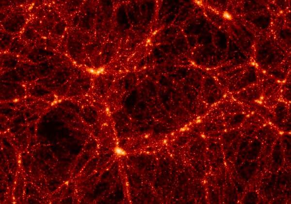 Image of the large-scale structure of the Universe, showing filaments and voids within the cosmic structure. Credit: Millennium Simulation Project