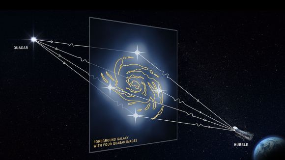 Gravitational lensing can make one quasar create many images. Credit: NASA/ESA/D. Player (STScI)