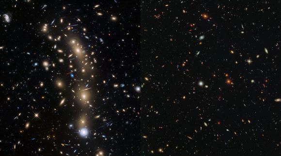 Images of the MACS J0416.1�2403 and Abell 2744 galaxy clusters, taken as part of the Hubble Frontier Fields program. Credit: NASA/ESA/HST Frontier Fields team (STScI)