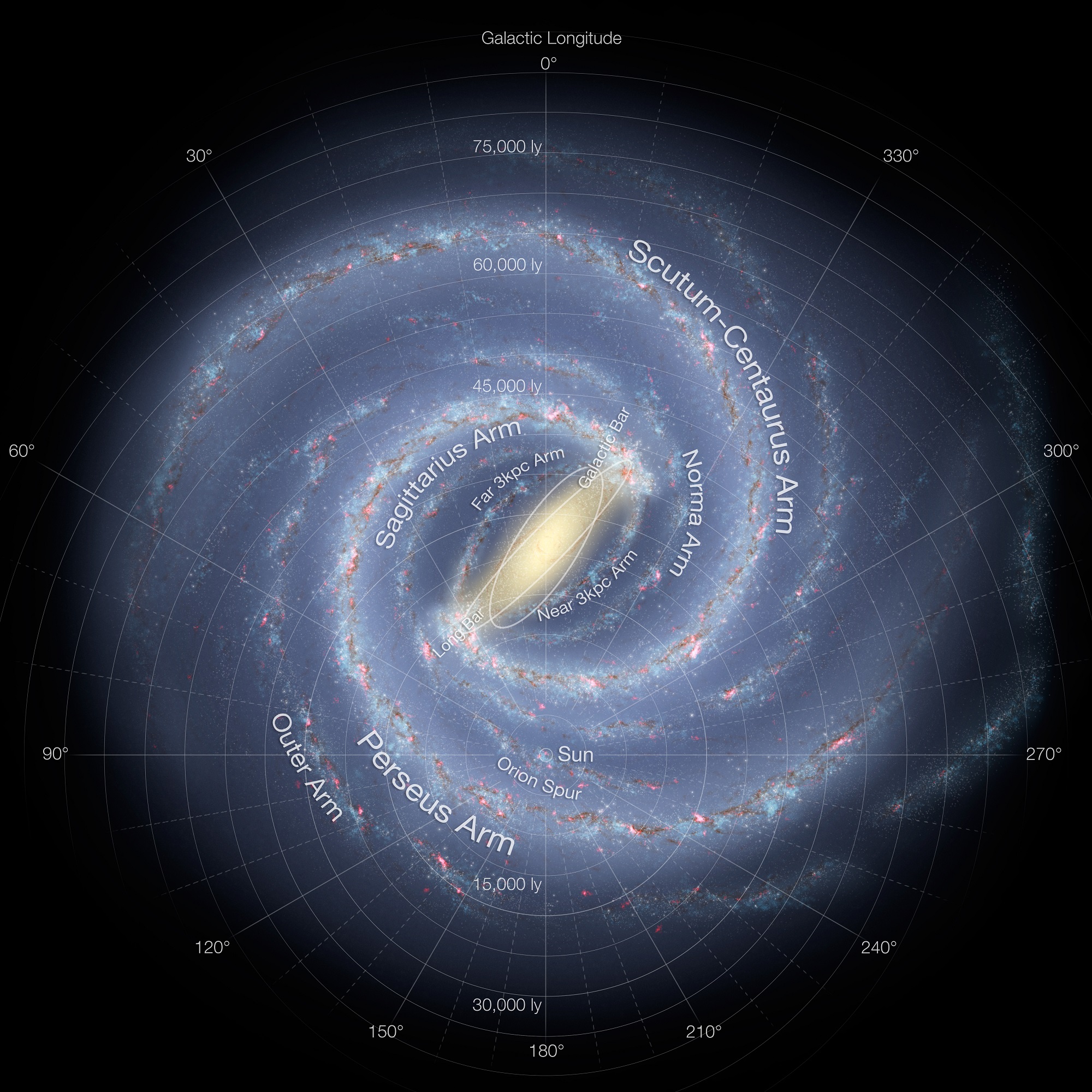 Artist's impression of the spiral structure of the Milky Way with two major stellar arms and a bar. Credit: NASA/JPL-Caltech/ESO/R. Hurt