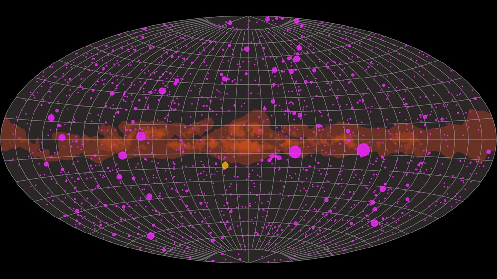 Cosmic fireworks, invisible to our eyes, fill the night sky. We can get a glimpse of this elusive light show thanks to the Large Area Telescope (LAT) aboard NASA’s Fermi Gamma-ray Space Telescope, which observes the sky in gamma rays, the highest-energy form of light. Image Credit: NASA’s Marshall Space Flight Center/Daniel Kocevski