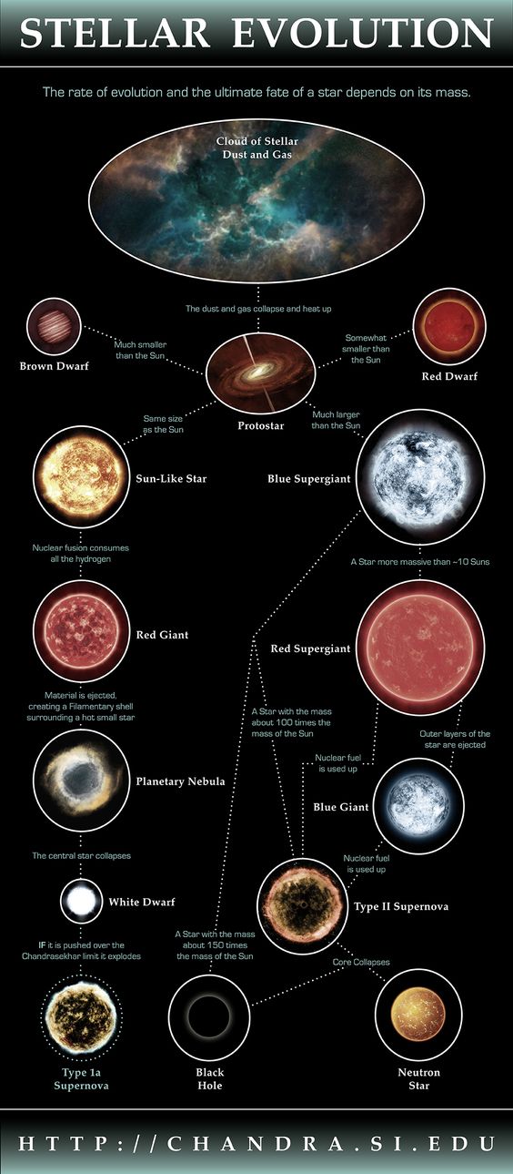 Saved from Harvard University Carol Tavares saved to The Universe Stellar Evolution Infographic: The rate of evolution and the ultimate fate of a star depends on its mass. (Illustration: NASA/CXC/M.Weiss)