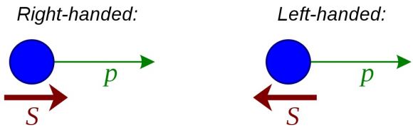 Left-handed and right-handed chirality. Credit: Wikipedia Every elementary particle has a rotation-like property known as spin. When a particle is shooting through space, the spin and motion can point along its direction of motion, or opposite to its motion. The former is known as right-handed chirality, while the latter is left-handed. Both matter and antimatter particles can have either chirality, except for the neutrino. Neutrinos are always left-handed, and anti-neutrinos are always right-handed.