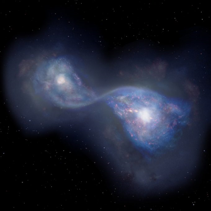 Artist’s impression of the merging galaxies B14-65666 located 13 billion light-years away. Credit: NAOJ.