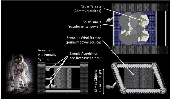 A look inside the AREE rover (next to an astronaut for scale). Wind would be channeled through the rover’s body for primary power. Rotating targets on top could be “pinged” by radar, sending data as Morse code. Image Credit: NASA/JPL-Caltech