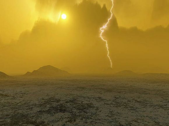 Artist’s impression of the atmosphere of Venus, showing its lightning storms and a volcano in the distance. Credit and ©: European Space Agency/J. Whatmore