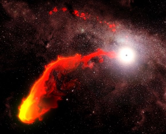 Illustration of gas cloud G2 approaching Sgr A*. Our central supermassive black hole periodically snacks on clouds and other materials like this. That gives off X-rays and other emissions. (ESO/MPE/M.Schartmann/J.Major)