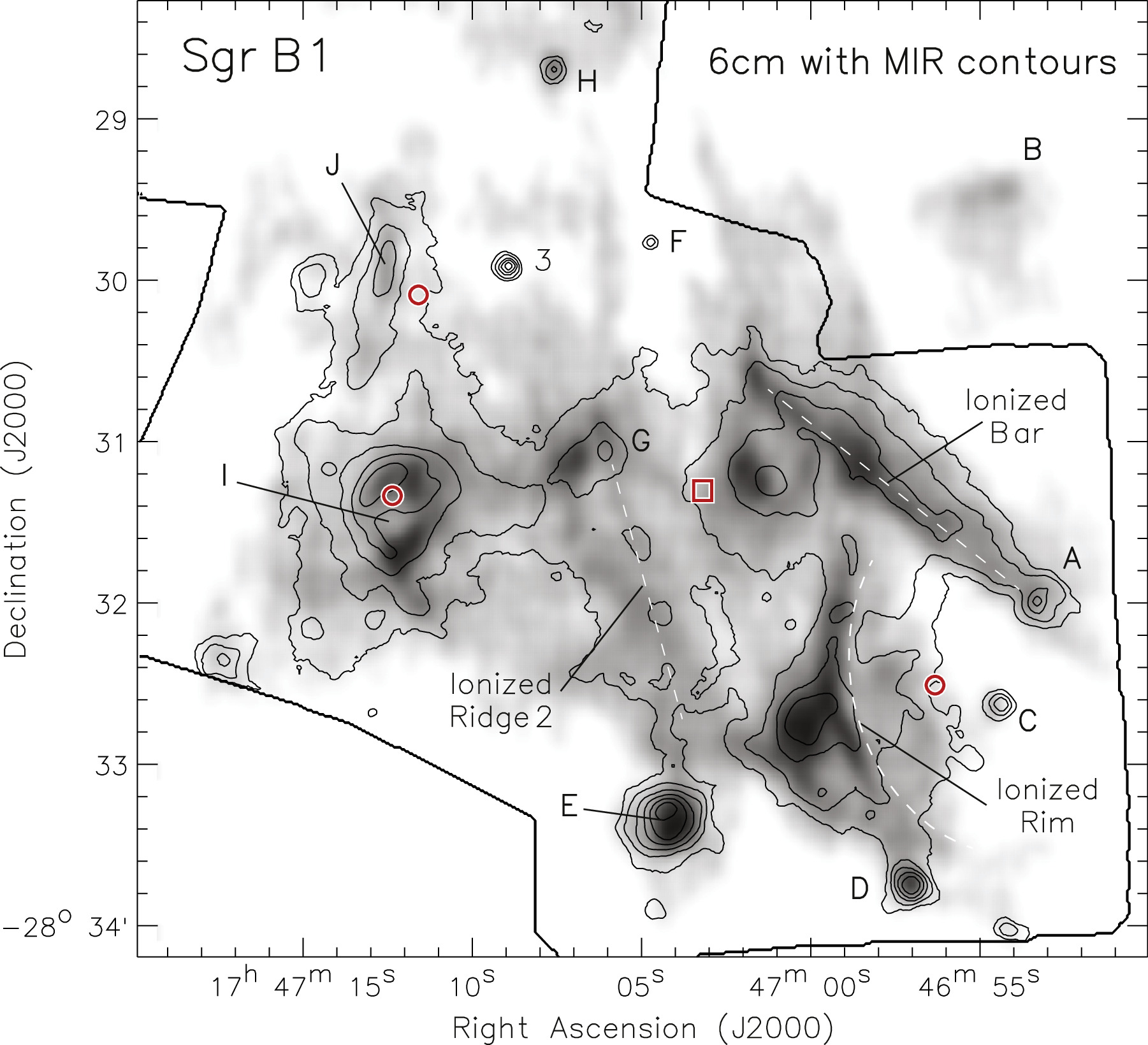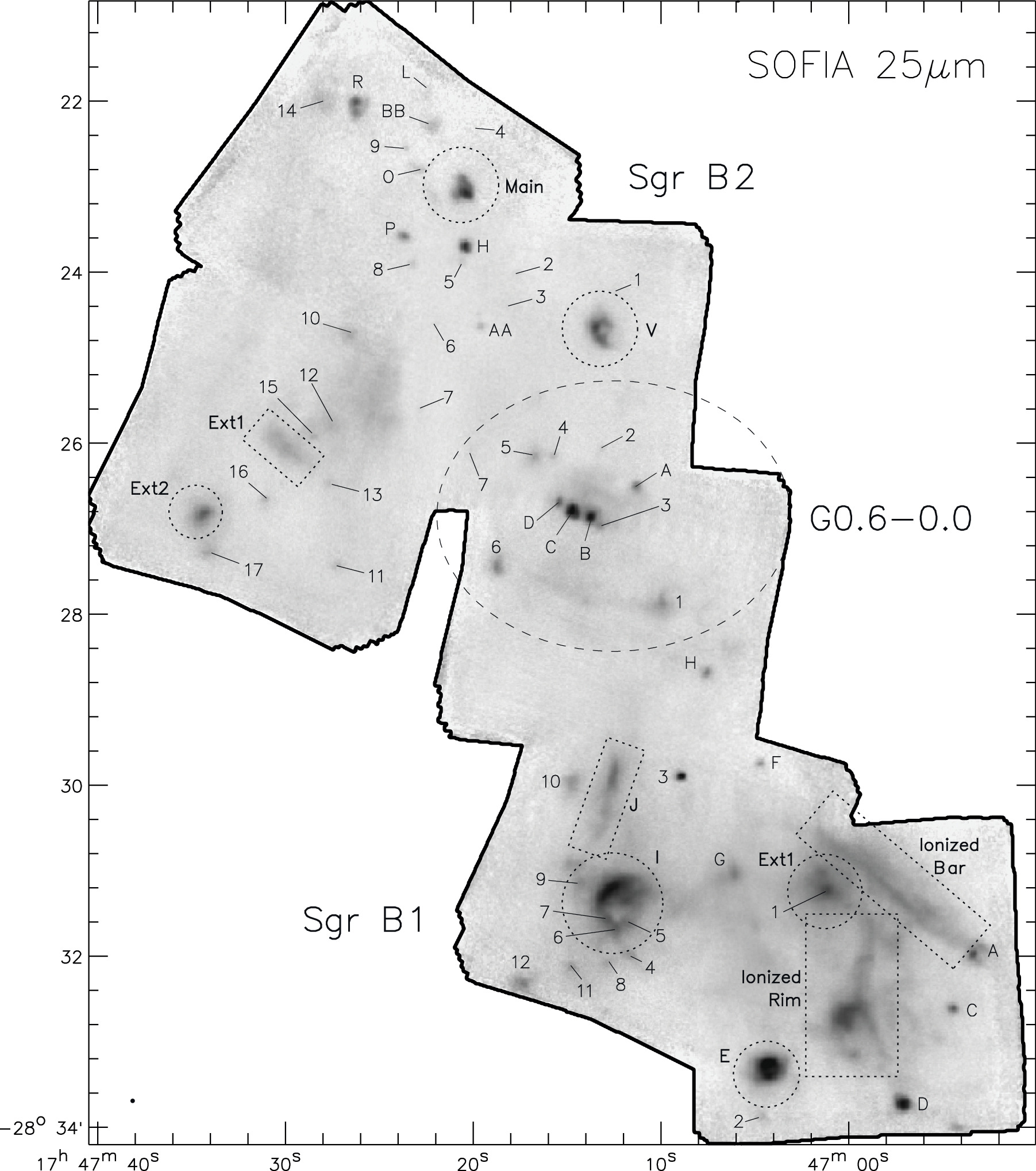 This figure from the research shows Sgr B1 and B2. MYSOs are marked in letters and numbers. Letters represent MYSOs identified as radio continuum sources and numbers represent MYSOs identified as infrared sources. Image Credit: De Buizer et al. 2025. The Astrophysical Journal.