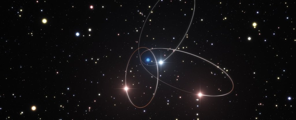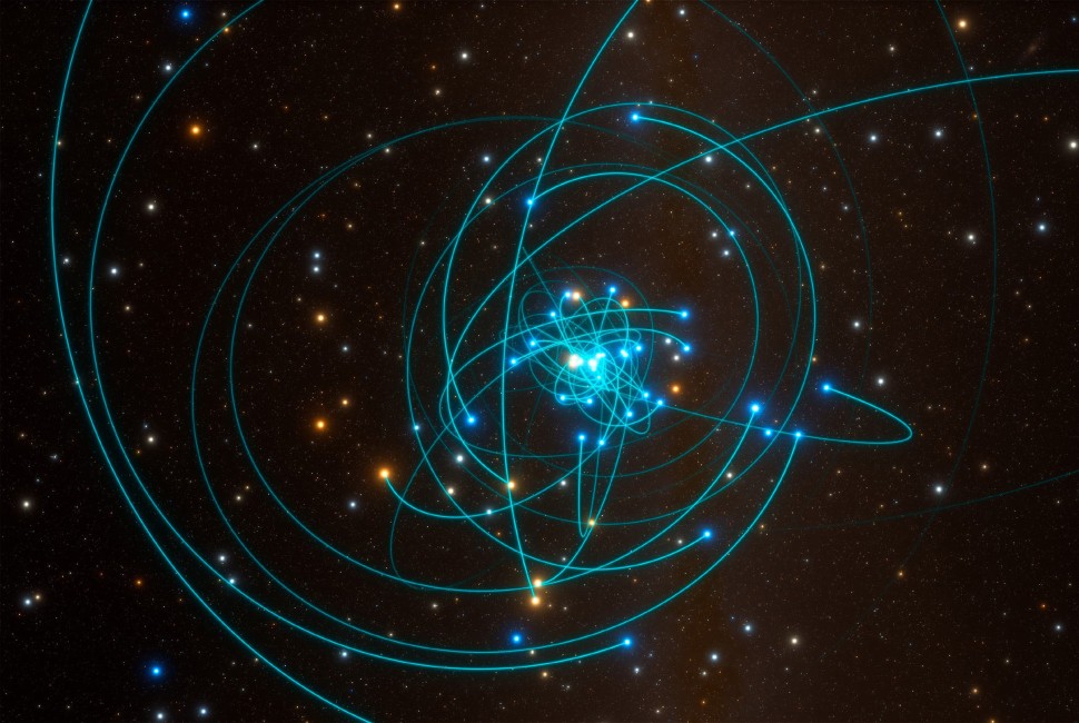 This illustration shows stars orbiting close to the Milky Way's central supermassive black hole. The black hole accelerates stars nearby and sends them crashing into one another. Credit: space engine ESO/L. Calçada/