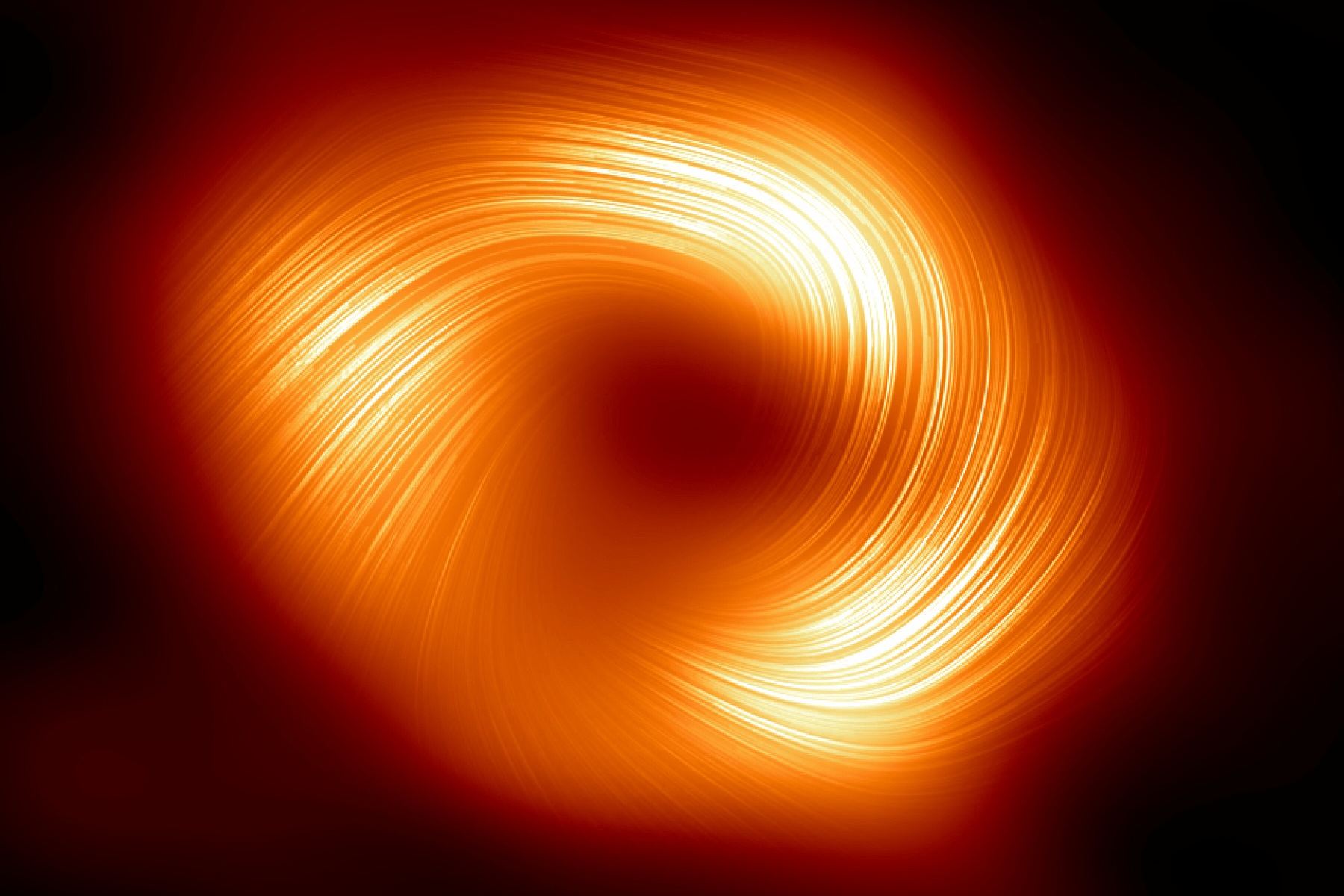 A new image from the Event Horizon Telescope shows lines of polarization, a signature of magnetic fields, around the shadow of the Milky Way's central black hole. (Credit: EHT Collaboration)