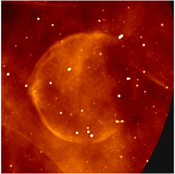A rare, almost-perfect spherical supernova remnant that has been discovered at the edge of the MeerKAT mosaic. Numerous compact radio sources are also visible, many of which signpost supermassive black holes at the centres of galaxies far beyond our own. There is also an intriguing tailed radio source visible on the right of the image, which could be an object in our galaxy moving at high speed, leaving a trailing wake. Credit: I. Heywood, SARAO. Image Description by SARAO