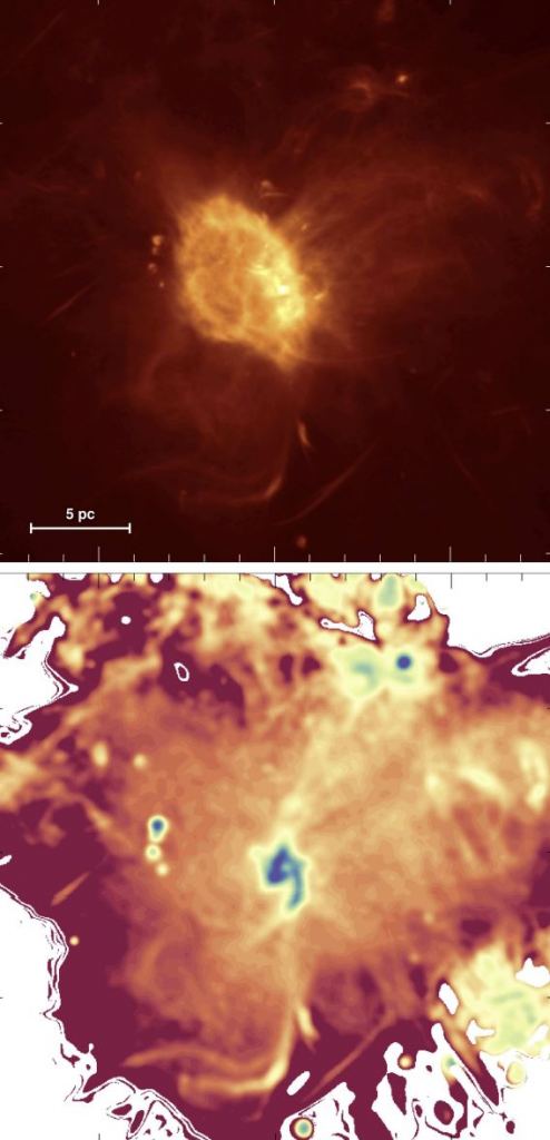 The upper panel’s glowing area shows a synchrotron radiation halo surrounding the supermassive black hole at the centre of the galaxy. The radiation highlights the flows of gas funneling toward the black hole. As the gas approaches the black hole, it is heated beginning to ionize where electrons are stripped from the gas. The ionized gas appears as a “mini-spiral” in the lower panel within about five light years of the central black hole. The scale on the top panel shows 5pc (parsecs or about 16 light years). In other words, this cloud of ionized gases and synchrotron radiation swirling about our black hole is light years across. Credit Heywood et al Figure 14