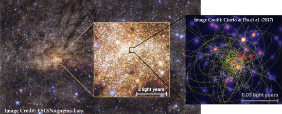 The Milky Way galaxy hosts a supermassive black hole (Sgr A*, shown in the inset on the right) embedded in the Nuclear Star Cluster (NSC) at the center, highlighted and enlarged in the middle panel. The image on the right shows the stellar density in the NSC. Image Credit: Zhuo Chen