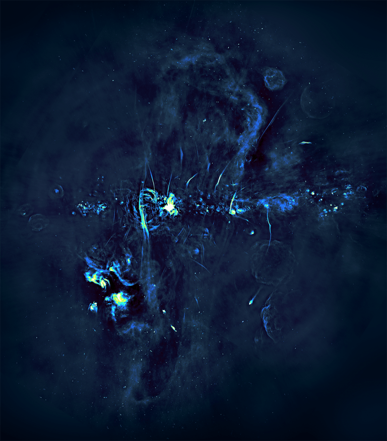 This cirrus cloud-like emission from the Galactic centre super bubble dominates this image. This is traversed by a complex of many parallel filaments. The radio bubble nestles against the diffuse Sagittarius A region in the lower centre of the image. The bright dot near the centre of this region is Sagittarius A*, a 4 million solar mass black hole. This image captures the chaotic complexity of the very heart of our Galaxy. Credit: I. Heywood, SARAO Image Description SARAO