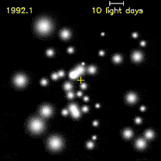 A time-lapse movie in infrared light detailing how stars in the central light-year of our Galaxy have moved over a period of 14 years. The yellow mark at the image center represents the location of Sgr A*. Credit: A. Eckart (U. Koeln) & R. Genzel (MPE-Garching), SHARP I, NTT, La Silla Obs., ESO
