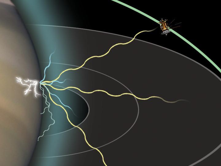 This artist concept shows how Cassini is able to detect radio signals from lightning on Saturn. Lightning strokes emit electromagnetic energy across a broad range of wavelengths, including the visual wavelengths we see and long radio wavelengths that cause static on an AM radio during a thunderstorm. Some of the radio waves propagate upwards and can be detected at long distances by the radio and plasma wave science instrument on Cassini.