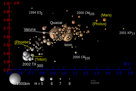 Colour indices are simple measures of the differences in the apparent magnitude of an object seen through blue (B), visible (V), i.e. green-yellow, and red (R) filters. The diagram illustrates known colour indices for all but the biggest objects (in slightly enhanced colour).[26] For reference, two moons: Triton and Phoebe, the centaur Pholus and the planet Mars are plotted (yellow labels, size not to scale).